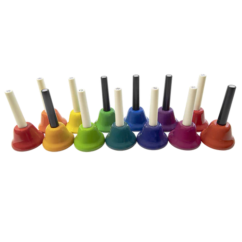 ¡Una octava cromática completa! Fabricadas con los más altos estándares, su construcción de alta calidad y su entonación precisa hacen de estas campanas la opción más económica del mercado. ¡Los colores CHROMA-NOTES® hacen que aprender y tocar con Boomwhackers sea aún más divertido! Cada campana de metal está marcada con la nota y el número correspondientes para ayudar a los niños a aprender la escala musical. Con 12,7 cm de alto, sus largas asas permiten sujetarlas con seguridad.